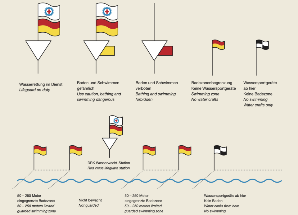 Bewachte Badestellen werden meistens mit Flaggen gekennzeichnet. Die Flaggen helfen dir, zu erkennen, ob die Rettungsschwimmer*innen im Dienst sind, welche Strandabschnitte bewacht werden und welche Gefahren es gerade gibt.